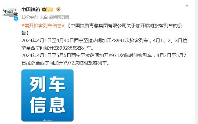 中新網(wǎng)3月22日電 據(jù)中國(guó)國(guó)家鐵路集團(tuán)有限公司官方微博消息,中國(guó)鐵路青藏集團(tuán)有限公司3月22日發(fā)布關(guān)于加開(kāi)臨時(shí)旅客列車的公告:2024年4月1日至4月30日西寧至拉薩間加開(kāi)Z8991次旅客列車,4月1、2、3日拉薩至西寧間加開(kāi)Z8992次旅客列車。2024年4月1日至5月5日西寧至拉薩間加開(kāi)Y971次臨時(shí)旅客列車,4月3日至5月7日拉薩至西寧間加開(kāi)Y972次臨時(shí)旅客列車。