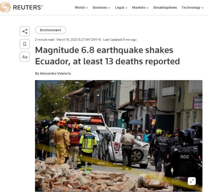 中新網(wǎng)3月19日 綜合外媒報道,當(dāng)?shù)貢r間18日約12時,厄瓜多爾發(fā)生6.8級地震,造成至少14人遇難,超過380人受傷,多處房屋、學(xué)校和醫(yī)療中心遭到結(jié)構(gòu)性破壞。