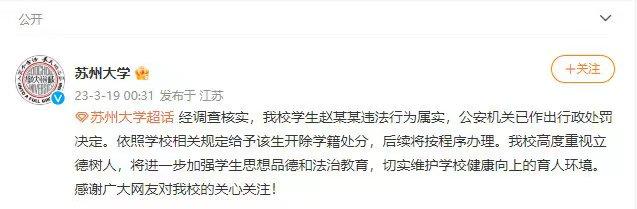 3月19日,蘇州大學發(fā)布通報:經(jīng)調(diào)查核實,我校學生趙某某違法行為屬實,公安機關已作出行政處罰決定。依照學校相關規(guī)定給予該生開除學籍處分,后續(xù)將按程序辦理。我校高度重視立德樹人,將進一步加強學生思想品德和法治教育,切實維護學校健康向上的育人環(huán)境。感謝廣大網(wǎng)友對我校的關心關注!