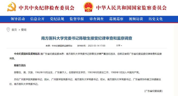 3月14日,中央紀委國家監(jiān)委發(fā)布兩則涉及醫(yī)藥衛(wèi)生領域干部被查的消息,落馬官員分別為南方醫(yī)科大學黨委書記陳敏生,廣西壯族自治區(qū)醫(yī)療保障局原黨組書記、局長王忠平。