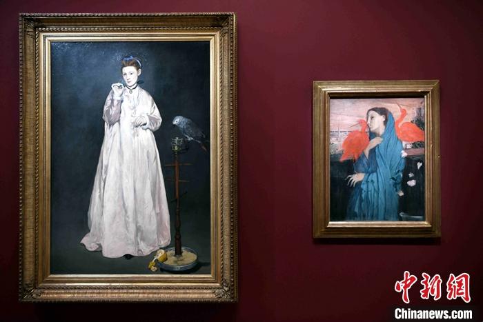 圖為馬奈與德加分別創(chuàng)作的兩幅女性肖像畫在并列展出。 中新社記者 李洋 攝