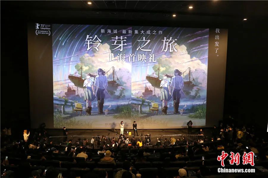 導演新海誠攜最新電影《鈴芽之旅》在上海萬達影城舉行首映式。陳玉宇 攝