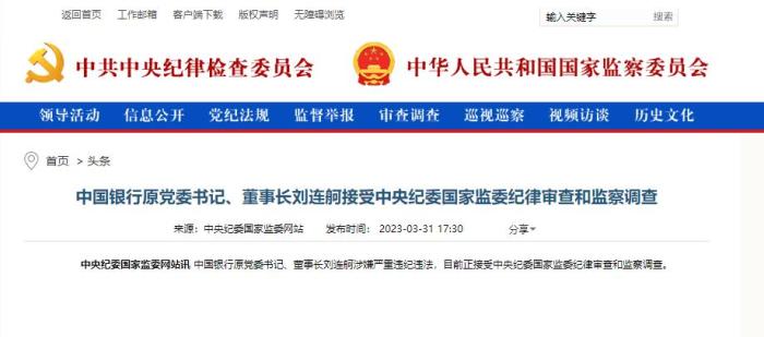據(jù)中央紀(jì)委國(guó)家監(jiān)委網(wǎng)站3月31日消息,中國(guó)銀行原黨委書(shū)記、董事長(zhǎng)劉連舸涉嫌嚴(yán)重違紀(jì)違法,目前正接受中央紀(jì)委國(guó)家監(jiān)委紀(jì)律審查和監(jiān)察調(diào)查。