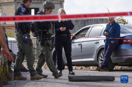 4月6日,在以色列北部的費(fèi)蘇塔鎮(zhèn),安全人員檢查一枚火箭彈殘骸。新華社發(fā)(阿亞爾·馬戈林?jǐn)z/基尼圖片社)