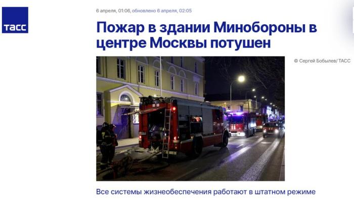 中新網(wǎng)4月6日電 據(jù)塔斯社報道,當(dāng)?shù)貢r間5日晚間,俄羅斯國防部位于莫斯科茲納門卡大街的一棟辦公大樓內(nèi)出現(xiàn)起火冒煙的情況,目前火勢已被撲滅,沒有人員受傷。