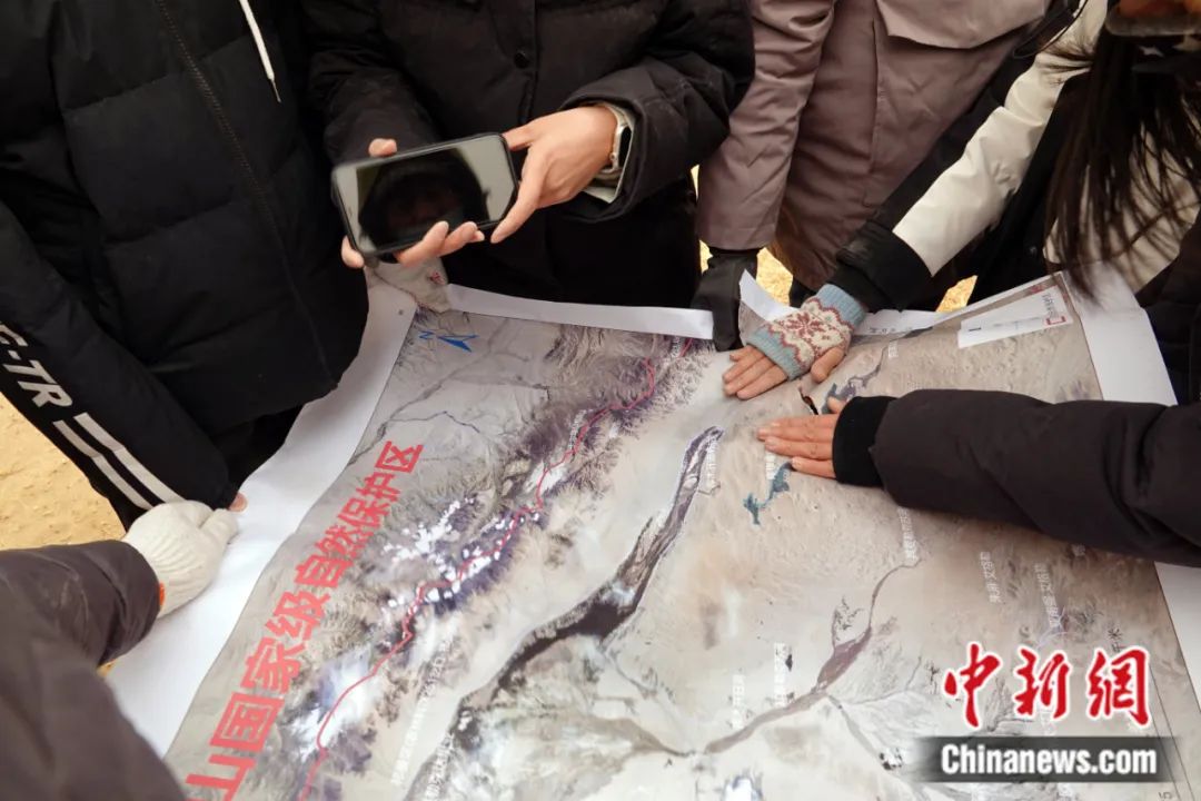 2023年4月,第三次新疆科考阿爾金山野外科考隊(duì)一行,前往阿爾金山國(guó)家級(jí)自然保護(hù)區(qū)庫(kù)木庫(kù)里沙漠的沙子泉考察調(diào)研,遭遇強(qiáng)沙塵暴天氣,科考隊(duì)員查看地圖。孫自法 攝