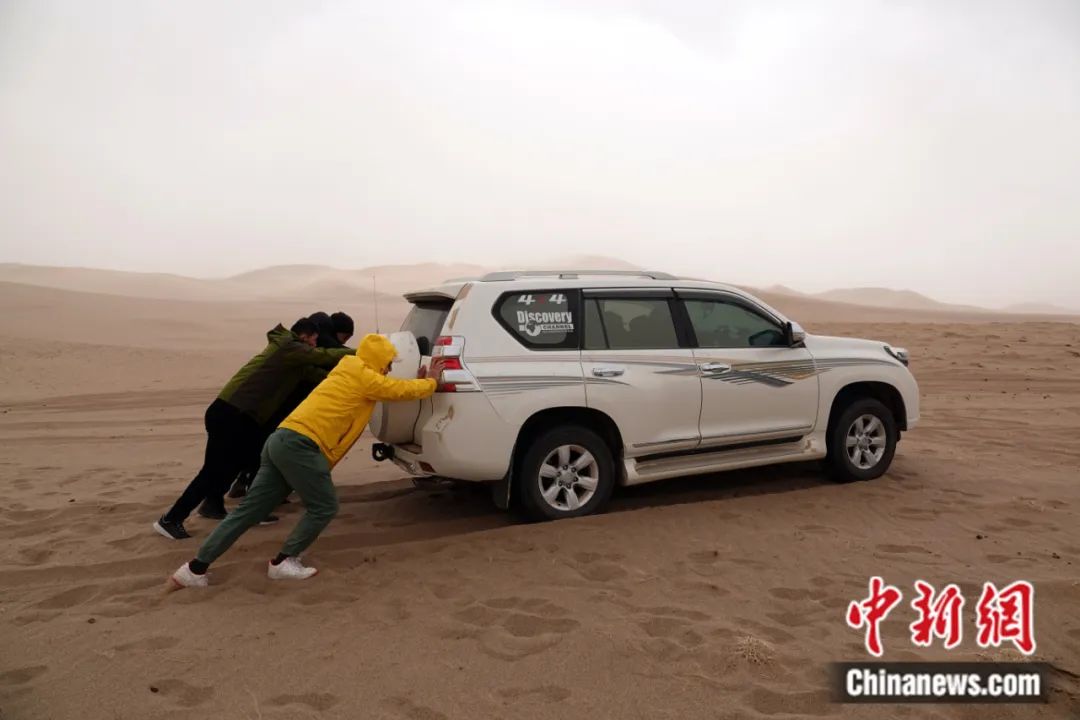 2023年4月,第三次新疆科考阿爾金山野外科考隊(duì)一行,前往阿爾金山國(guó)家級(jí)自然保護(hù)區(qū)庫(kù)木庫(kù)里沙漠的沙子泉考察調(diào)研,遭遇強(qiáng)沙塵暴天氣,科考隊(duì)員推車(chē)。孫自法 攝