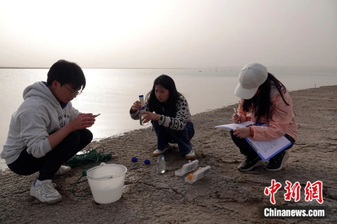 2023年3月,新疆若羌縣,參與第三次新疆科考任務(wù)的中國(guó)科學(xué)院新疆生態(tài)與地理研究所三名年輕研究生在途中采集水樣。孫自法 攝