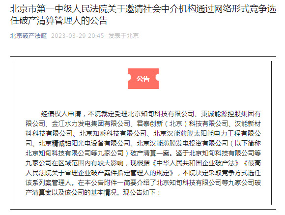 經(jīng)債權(quán)人申請,北京市第一中級人民法院裁定受理北京知旬科技有限公司、秉誠能源控股集團(tuán)有限公司、金江水力發(fā)電集團(tuán)有限公司、君泰創(chuàng)新(北京)科技有限公司、漢能新材料科技有限公司、北京知乘科技有限公司、北京漢能薄膜太陽能電力工程有限公司、北京精誠鉑陽光電設(shè)備有限公司、北京漢能薄膜發(fā)電投資有限公司破產(chǎn)清算一案。