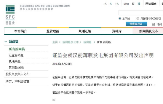 2015年5月28日,香港證監(jiān)會發(fā)表聲明稱,已就漢能薄膜發(fā)電的事務(wù)進(jìn)行調(diào)查。2015年7月15日,漢能薄膜發(fā)電遭香港證監(jiān)會勒令停牌。