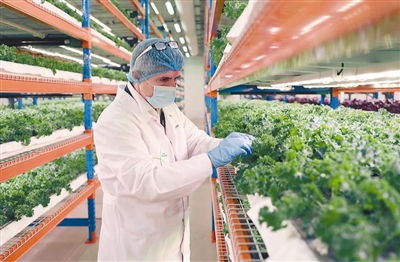 走進(jìn)農(nóng)場,記者如同進(jìn)入一座實驗室——進(jìn)入車間需要經(jīng)過兩道門,工作人員均身著白大褂、戴著手套和發(fā)套;又像來到一個大型倉儲市場——一排排貨架上,整齊擺放著各種蔬菜,工作人員有時需要踩著梯子取放物品。農(nóng)場生產(chǎn)經(jīng)理羅伯特·費洛斯說,這里更像一個現(xiàn)代化的生產(chǎn)車間,溫度、濕度、光照都進(jìn)行自動化控制,為蔬菜提供更精準(zhǔn)、更高效的生長環(huán)境。