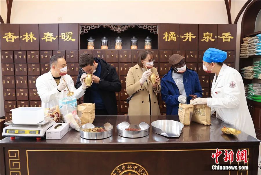 來(lái)自比利時(shí)、白俄羅斯和加納的外國(guó)友人在山東東營(yíng)一家中醫(yī)醫(yī)院的中藥房識(shí)別、稱(chēng)量中藥材。周廣學(xué) 攝