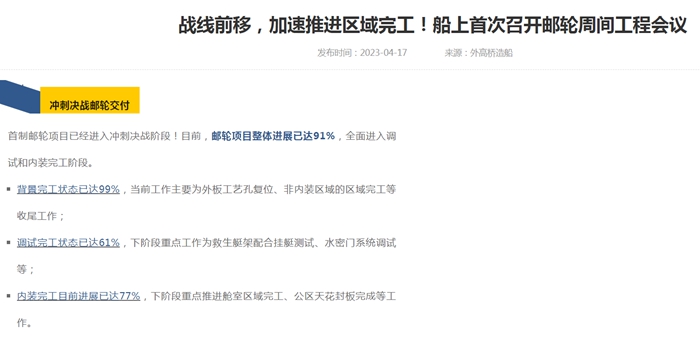 外高橋造船公布首艘國(guó)產(chǎn)大郵輪最新進(jìn)展情況。外高橋造船網(wǎng)站截圖