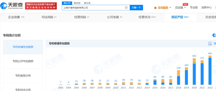天眼查顯示,近三年,外高橋造船專利申請(qǐng)數(shù)量猛增,2020年為401件,2021年371件,2022年達(dá)到441件。這其中有不少專利涉及到大型郵輪,例如“大型郵輪反彈式水封地漏”“大型郵輪醫(yī)院抽風(fēng)管過濾裝置”等。