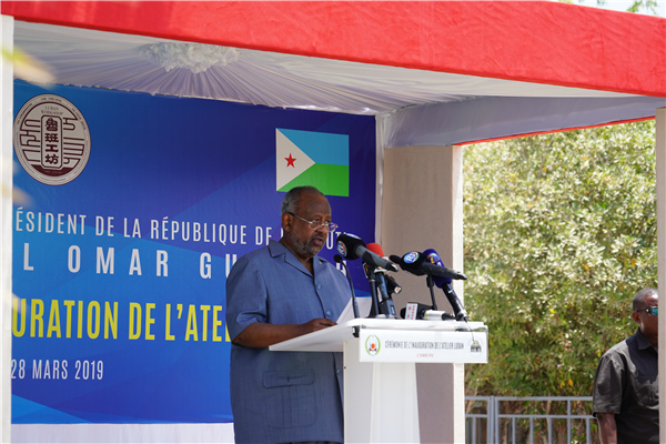 2019年3月28日,吉布提總統(tǒng)蓋萊在魯班工坊啟動儀式上致辭。天津鐵道職業(yè)技術(shù)學(xué)院供圖