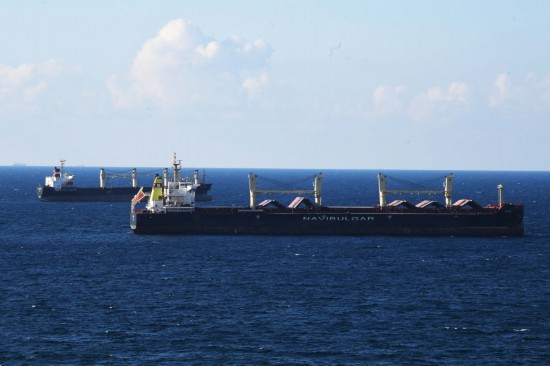 2022年8月6日,從烏克蘭出發(fā)的第二批運糧船抵達土耳其伊斯坦布爾的博斯普魯斯海峽黑海入海口附近。(新華社記者沙達提攝)
