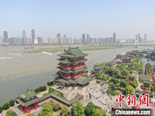 圖為2021年5月2日, 位于江西南昌贛江之畔的江南名樓滕王閣迎來眾多游客。(無人機(jī)照片) 中新社記者 劉占昆 攝
