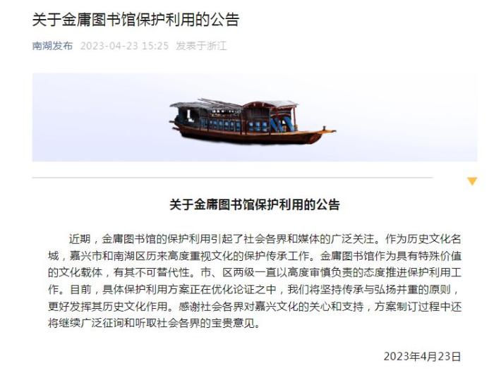中新網(wǎng)4月23日電 近期,金庸圖書(shū)館的保護(hù)利用引發(fā)關(guān)注。浙江省嘉興市南湖區(qū)人民政府今日通過(guò)微信公眾號(hào)發(fā)布公告稱,作為歷史文化名城,嘉興市和南湖區(qū)歷來(lái)高度重視文化的保護(hù)傳承工作。金庸圖書(shū)館作為具有特殊價(jià)值的文化載體,有其不可替代性。市、區(qū)兩級(jí)一直以高度審慎負(fù)責(zé)的態(tài)度推進(jìn)保護(hù)利用工作。目前,具體保護(hù)利用方案正在優(yōu)化論證之中,南湖區(qū)將堅(jiān)持傳承與弘揚(yáng)并重的原則,更好發(fā)揮其歷史文化作用。感謝社會(huì)各界對(duì)嘉興文化的關(guān)心和支持,方案制訂過(guò)程中還將繼續(xù)廣泛征詢和聽(tīng)取社會(huì)各界的寶貴意見(jiàn)。
