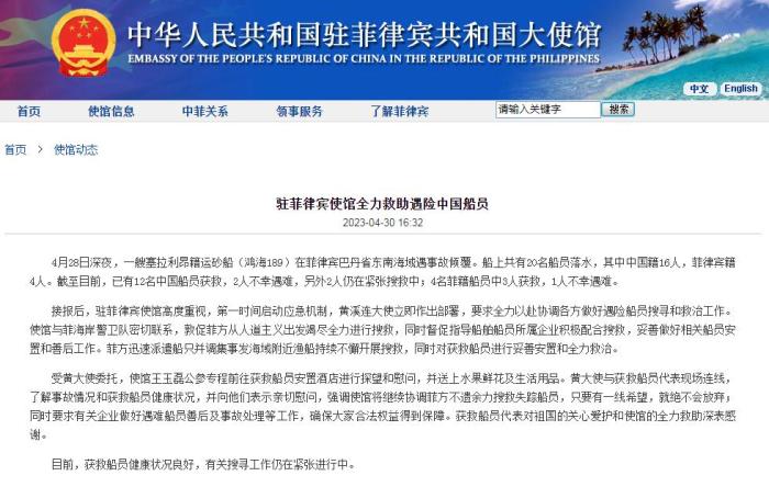 接報后,駐菲律賓使館高度重視,第一時間啟動應急機制,黃溪連大使立即作出部署,要求全力以赴協(xié)調各方做好遇險船員搜尋和救治工作。使館與菲海岸警衛(wèi)隊密切聯(lián)系,敦促菲方從人道主義出發(fā)竭盡全力進行搜救,同時督促指導船舶船員所屬企業(yè)積極配合搜救,妥善做好相關船員安置和善后工作。菲方迅速派遣船只并調集事發(fā)海域附近漁船持續(xù)不懈開展搜救,同時對獲救船員進行妥善安置和全力救治。