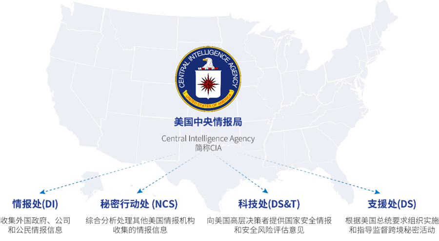 CIA是美國聯(lián)邦政府主要情報(bào)機(jī)構(gòu)之一,總部位于美國弗吉尼亞州蘭利,下設(shè)情報(bào)處(DI)、秘密行動處(NCS)、科技處(DS&T)、支援處(DS)四個部門。其主要業(yè)務(wù)范圍涉及:收集外國政府、公司和公民情報(bào)信息;綜合分析處理其他美國情報(bào)機(jī)構(gòu)收集的情報(bào)信息;向美國高層決策者提供國家安全情報(bào)和安全風(fēng)險(xiǎn)評估意見;根據(jù)美國總統(tǒng)要求組織實(shí)施和指導(dǎo)監(jiān)督跨境秘密活動等。