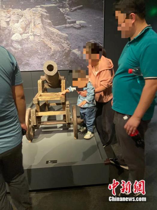 該展區(qū)展示的是明清時(shí)期火器等主力兵器,有禁止觸摸標(biāo)識(shí),但由于部分展品未設(shè)置圍欄,游客隨手可以觸碰到藏品,甚至有家長(zhǎng)抱著孩子與藏品“親密接觸”。此外,現(xiàn)場(chǎng)還有游客大聲喧嘩的情況。