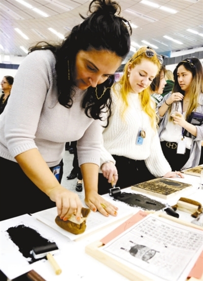 參觀者在體驗中國傳統(tǒng)拓印。