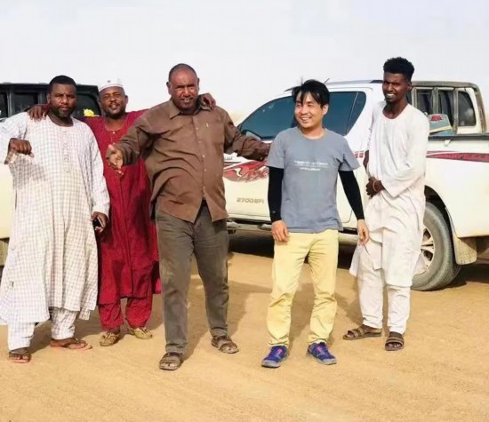 岳遠志(右二)在蘇丹與當(dāng)?shù)嘏笥押嫌?。受訪者供圖