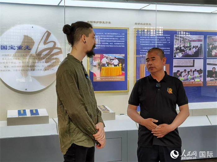 人民網(wǎng)意大利籍記者采訪云居寺文物管理處黨支部副書記、副主任李曙平(右一)。人民網(wǎng) 魯揚(yáng)攝
