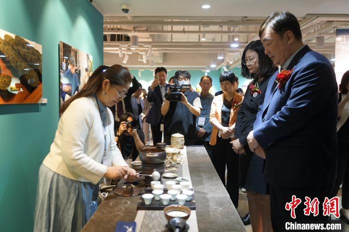 當?shù)貢r間23日,“茶和天下·雅集”活動開幕式暨茶韻山水——“綠水青山就是金山銀山”浙江省文旅圖片展在首爾中國文化中心舉行。圖為長興紫筍茶體驗。中新社記者 劉旭 攝