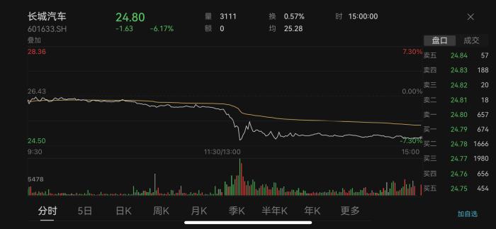 25日盤中,長城汽車一度跌超7%,比亞迪跌超2%。截至收盤,長城汽車股價報24.80元,下跌6.17%。比亞迪股價報255.60元,下跌2.41%。汽車整車板塊則下跌0.85%。有股民留言,“最慘的是同時擁有重倉長城汽車和比亞迪的股民,例如我,太慘了?!?/p>