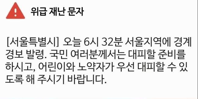 “今天6時32分首爾地區(qū)發(fā)布警戒警報。請各位國民做好躲避準備,讓兒童和老弱者優(yōu)先躲避?!碑斕烨宄?,首爾市民收到這條危急災(zāi)害通知,手機同時響起警笛聲。