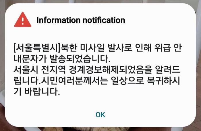 7時26分左右,首爾市再次發(fā)布通知稱,“由于朝鮮發(fā)射導(dǎo)彈,發(fā)送了危急災(zāi)害通知。在此通知,首爾市整個地區(qū)的警戒警報已經(jīng)解除。希望各位市民回到日常生活中去?!?/p>