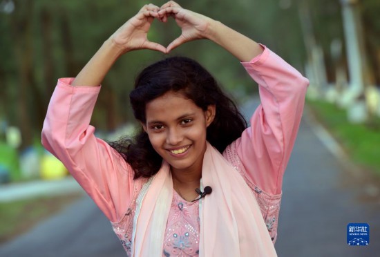 5月26日,在孟加拉國首都達(dá)卡,阿里法·沁做出愛心手勢(shì)表達(dá)對(duì)中國的愛意。新華社發(fā)