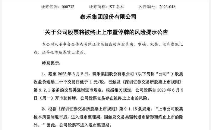 6月2日晚間,ST泰禾公告,截至當日,公司股票收盤價連續(xù)20個交易日低于1元/股,已觸及交易類強制退市規(guī)定。根據(jù)相關規(guī)定,公司股票自6月5日開市起停牌,公司股票交易存在被終止上市的風險。