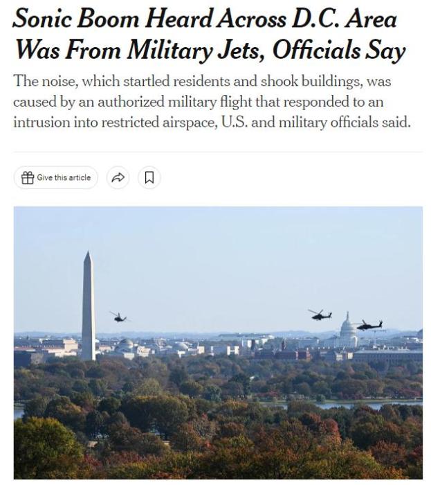 當(dāng)?shù)貢r(shí)間4日,一架塞斯納輕型飛機(jī)疑似闖入華盛頓上空,美軍F-16噴氣式戰(zhàn)斗機(jī)緊急起飛高速追擊,并在美國首都上空引發(fā)音爆。期間,美軍試圖與塞斯納飛機(jī)上的飛行員建立聯(lián)系。