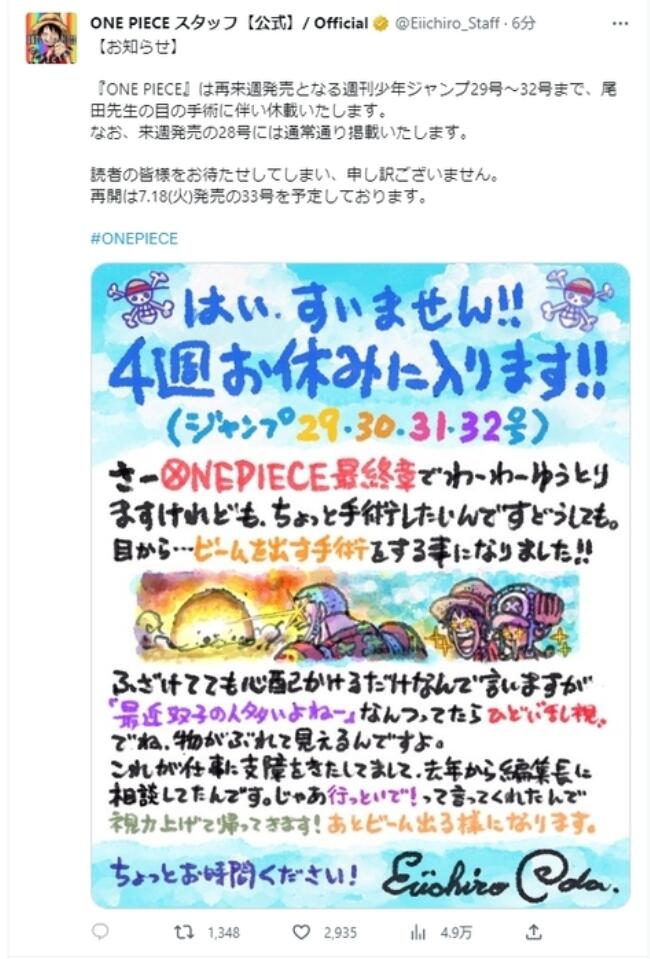 其官網(wǎng)還發(fā)布了尾田榮一郎在自己的手繪插畫上寫的“請假條”。他表示:“非常抱歉,我將休息四周時間?!逗胶M酢冯m然已經(jīng)進入終章,但由于眼睛的散光很嚴重,看東西時出現(xiàn)重影,所以需要做個手術(shù)。請給我一些時間(修養(yǎng)一下)?!?/p>