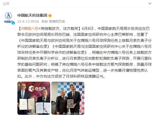 中新網(wǎng)6月13日電 據(jù)中國航天科技集團(tuán)有限公司官方微博消息,6月8日,中國國家航天局局長張克儉在巴黎會(huì)見歐洲空間局局長阿蘇巴赫、法國國家空間研究中心主席巴蒂斯特,簽署了《中國國家航天局與歐洲空間局關(guān)于在嫦娥六號(hào)月球探測任務(wù)上搭載月表負(fù)離子分析儀的諒解備忘錄》《中國國家航天局與法國國家空間研究中心關(guān)于在嫦娥六號(hào)月球采樣任務(wù)中開展科學(xué)合作的諒解備忘錄》,明確在中方嫦娥六號(hào)任務(wù)上搭載歐方研制的月表負(fù)離子分析儀,進(jìn)行月表原位反向散射和濺射負(fù)離子探測,開展行星科學(xué)的基礎(chǔ)問題研究;明確了將在嫦娥六號(hào)任務(wù)中搭載法方氡氣探測載荷,測量月球表面的氡氣及其衰變產(chǎn)物,優(yōu)化月球氣體輸運(yùn)模型,進(jìn)一步完善月壤物理性質(zhì)認(rèn)知。此外,中方向法方頒發(fā)了月球科研樣品饋贈(zèng)證書。