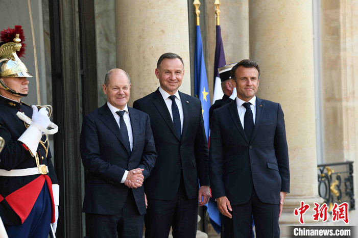 當(dāng)?shù)貢r間6月12日晚,法國總統(tǒng)馬克龍在巴黎愛麗舍宮與德國總理朔爾茨、波蘭總統(tǒng)杜達(dá)會面。他們共同出席“魏瑪三角”機(jī)制下的三國領(lǐng)導(dǎo)人會議。 中新社記者 李洋 攝