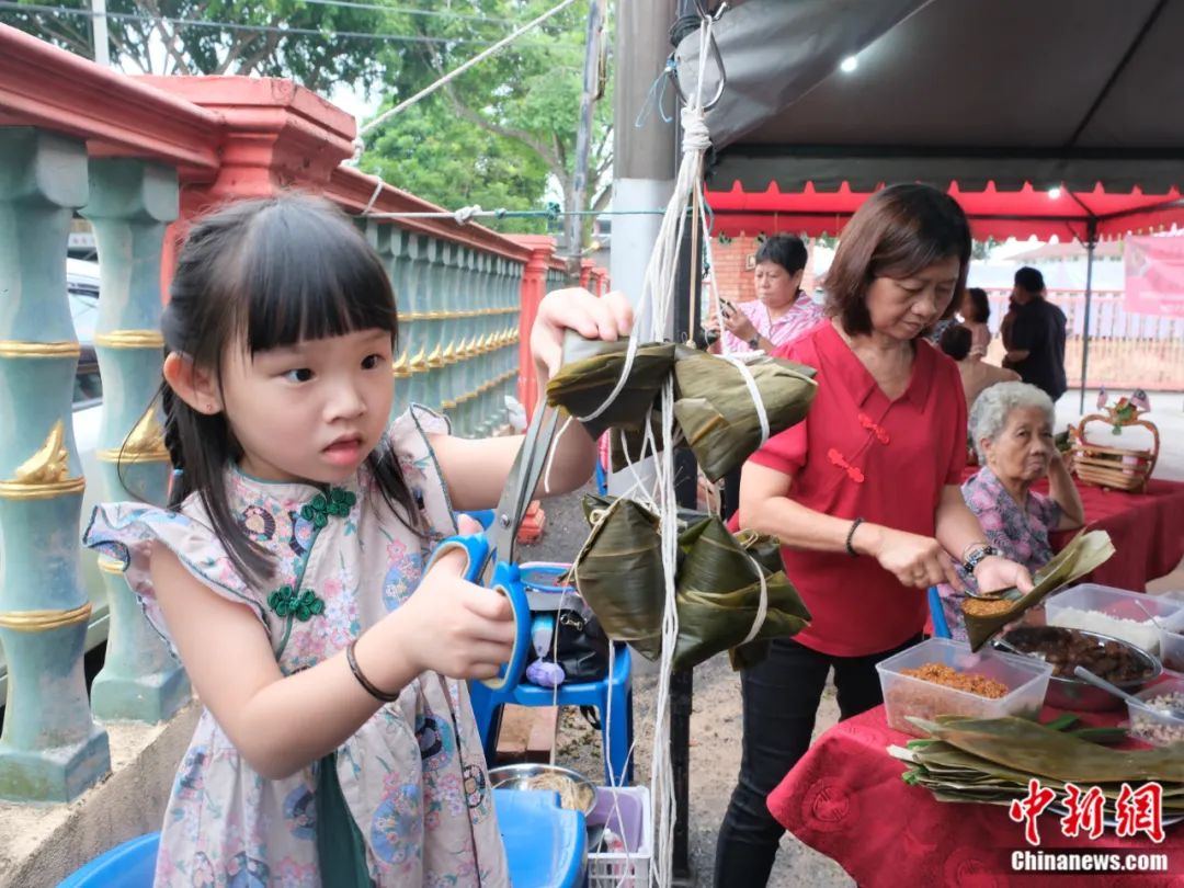 2023年6月18日,馬來西亞馬六甲舉行端午龍舟系列活動(dòng),包括游龍舟、裹粽比賽等,吸引當(dāng)?shù)馗髯逡崦癖妳⑴c。圖為有的家庭四代同堂齊上陣。奶奶在一旁包粽子,四歲的曾馨怡小朋友給包好的粽子修剪粽葉。陳悅 攝