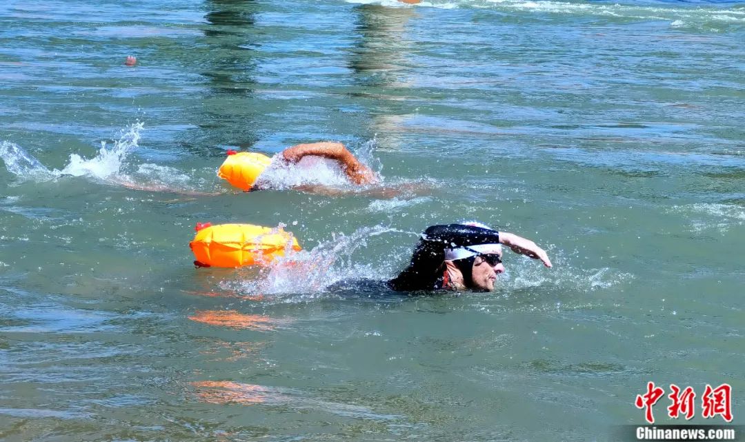 2022年7月,來自德國、美國、英國、比利時(shí)、俄羅斯等20個(gè)國家和地區(qū)的211名運(yùn)動(dòng)員和競技愛好者,在青海省黃河上游水域參加搶渡黃河極限挑戰(zhàn)賽。李雋 攝