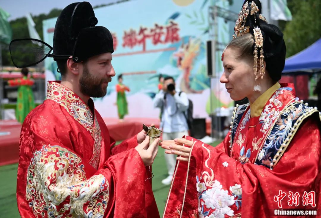 2013年6月16日,一對(duì)外國夫婦品嘗粽子。當(dāng)天,一場外國友人體驗(yàn)端午節(jié)習(xí)俗的活動(dòng)在吉林長春舉行,近百名外國友人通過穿漢服、品嘗粽子、戴香包、投壺等“沉浸式”體驗(yàn)活動(dòng),感受中國傳統(tǒng)節(jié)日的魅力。張瑤 攝