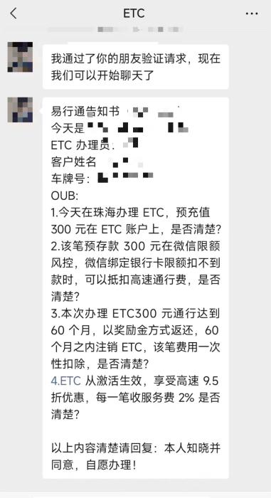 黃斌辦理ETC結(jié)束后,地推人員發(fā)給黃斌的易行通告知書(央廣網(wǎng)發(fā) 受訪者供圖)