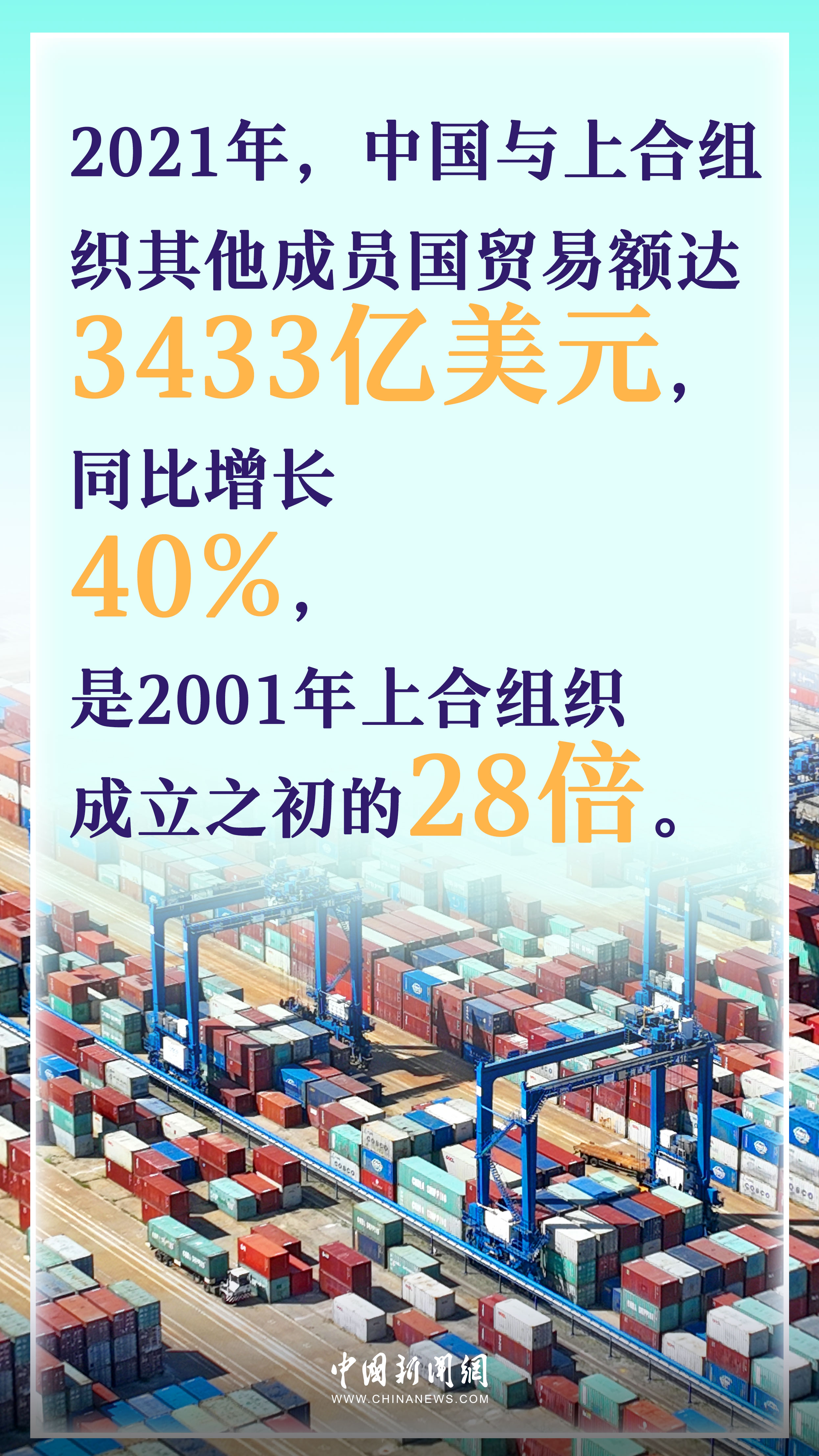 據(jù)統(tǒng)計,2021年,上合組織成員國國內生產(chǎn)總值總和約為23.3萬億美元,占全球GDP近四分之一,比成立之初擴大了13倍多。其中,中國的作用也在日益凸顯,同年,中國與上合組織其他成員國貿(mào)易額達3433億美元,同比增長40%,是2001年上合組織成立之初的28倍。