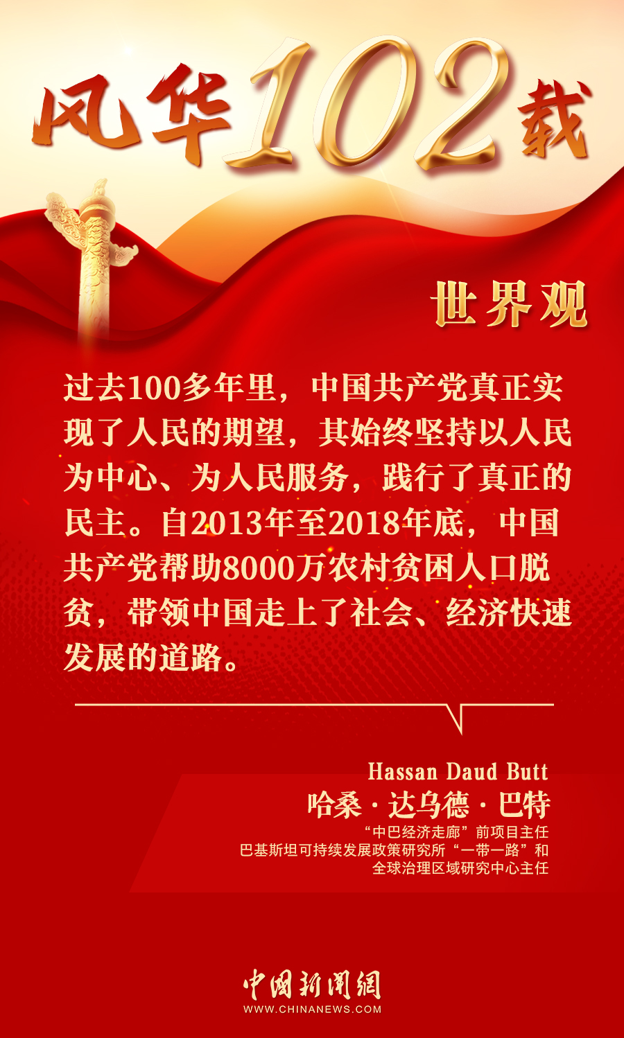 中新網(wǎng)7月8日電(陳彩霞)日前,投資領(lǐng)域?qū)<?,“中巴?jīng)濟(jì)走廊”前項目主任、巴基斯坦可持續(xù)發(fā)展政策研究所“一帶一路”和全球治理區(qū)域研究中心主任哈?!み_(dá)烏德·巴特(Hassan Daud Butt)在接受中新網(wǎng)專訪時表示,過去100多年里,中國共產(chǎn)黨真正實現(xiàn)了人民的期望,其始終堅持以人民為中心、為人民服務(wù),帶領(lǐng)中國走上了社會、經(jīng)濟(jì)快速發(fā)展的道路。