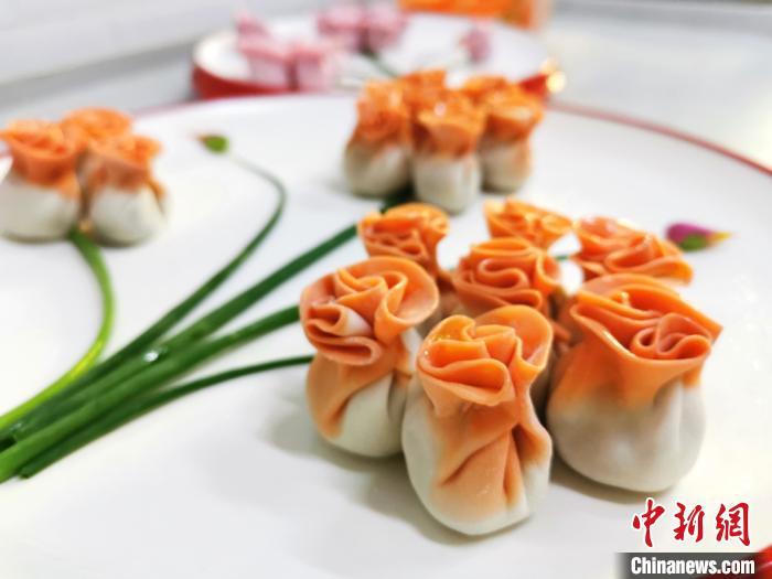 資料圖:圖為以胡蘿卜汁和面包成的“花餃子”,顏色艷麗。 閆姣 攝