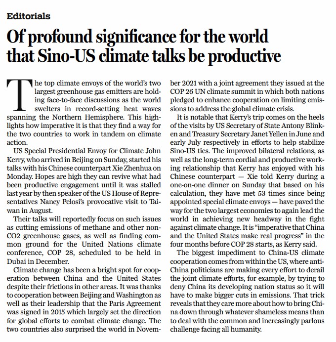 在舉世關(guān)注中,世界最大的兩個(gè)經(jīng)濟(jì)體的氣候特使舉行了面對面會(huì)談。當(dāng)前,北半球正在經(jīng)歷創(chuàng)紀(jì)錄的熱浪,凸顯了中美在氣候問題上攜手合作多么重要。