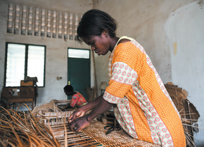 6月21日,在位于布隆迪經(jīng)濟(jì)首都布瓊布拉的卡蒙蓋手工業(yè)培訓(xùn)中心,學(xué)員在生產(chǎn)車間制作藤編產(chǎn)品。