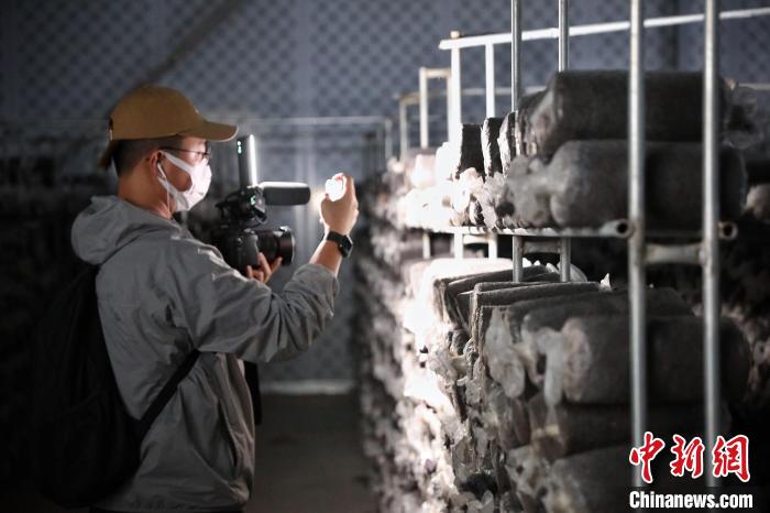 7月17日,甘肅省古浪縣,參加“絲路風采 如意甘肅”聯(lián)合采訪活動的兩岸及香港記者在當?shù)仞B(yǎng)菌出菇的冷庫內(nèi)采訪拍攝。 中新社記者 李雪峰 攝