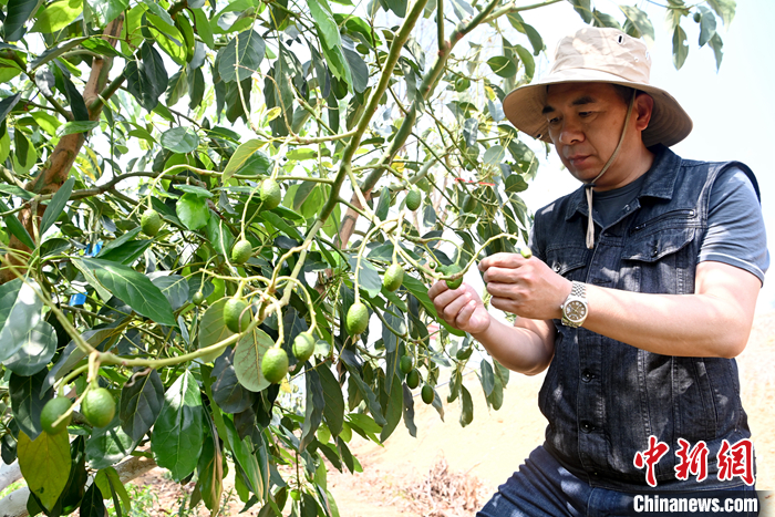圖為4月27日,汪志哲檢查牛油果長勢。 中新社記者 李嘉嫻 攝