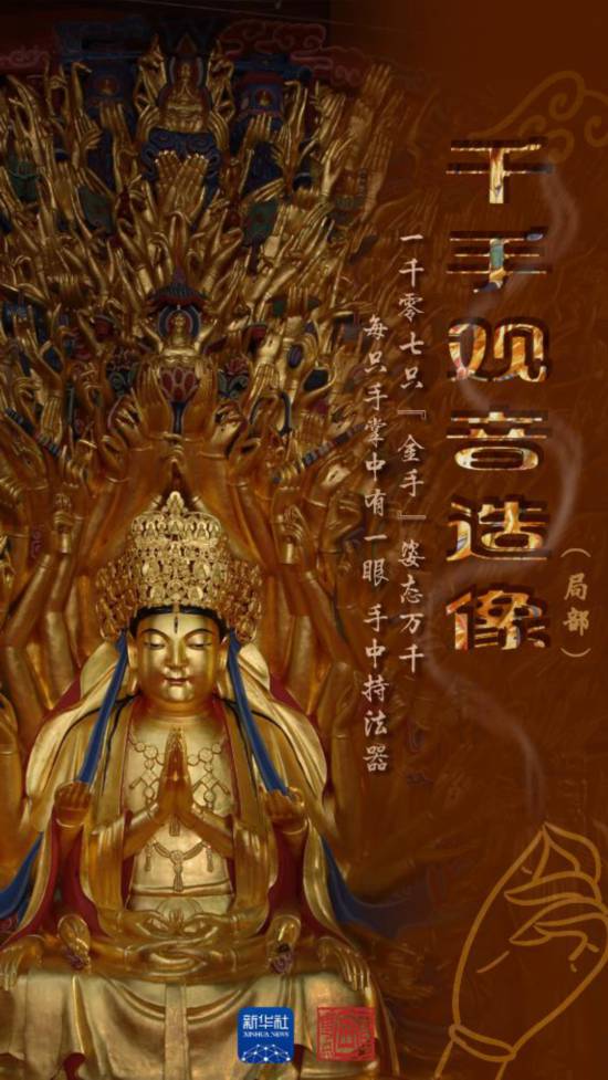走近看,這座造像頭頂和兩側,孔雀開屏般放射狀地浮雕著1007只“金手”。造像手中的法器展現(xiàn)了古代人民的生活用具、勞動工具以及戰(zhàn)爭武器,有著重要的歷史價值。